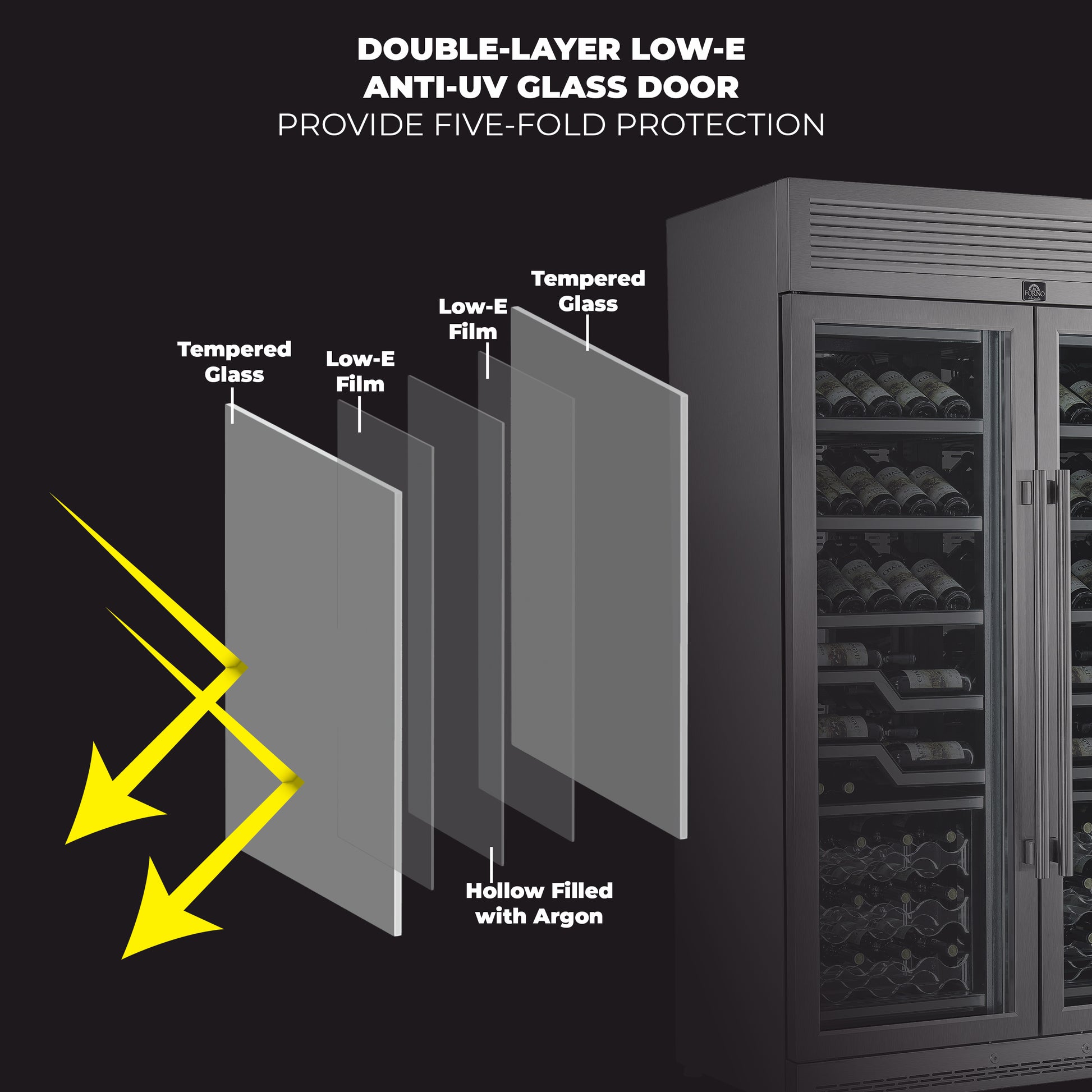 * The double-layer anti-UV glass door shields your wine collection from harmful UV rays, preserving the rich flavors and integrity of every bottle.