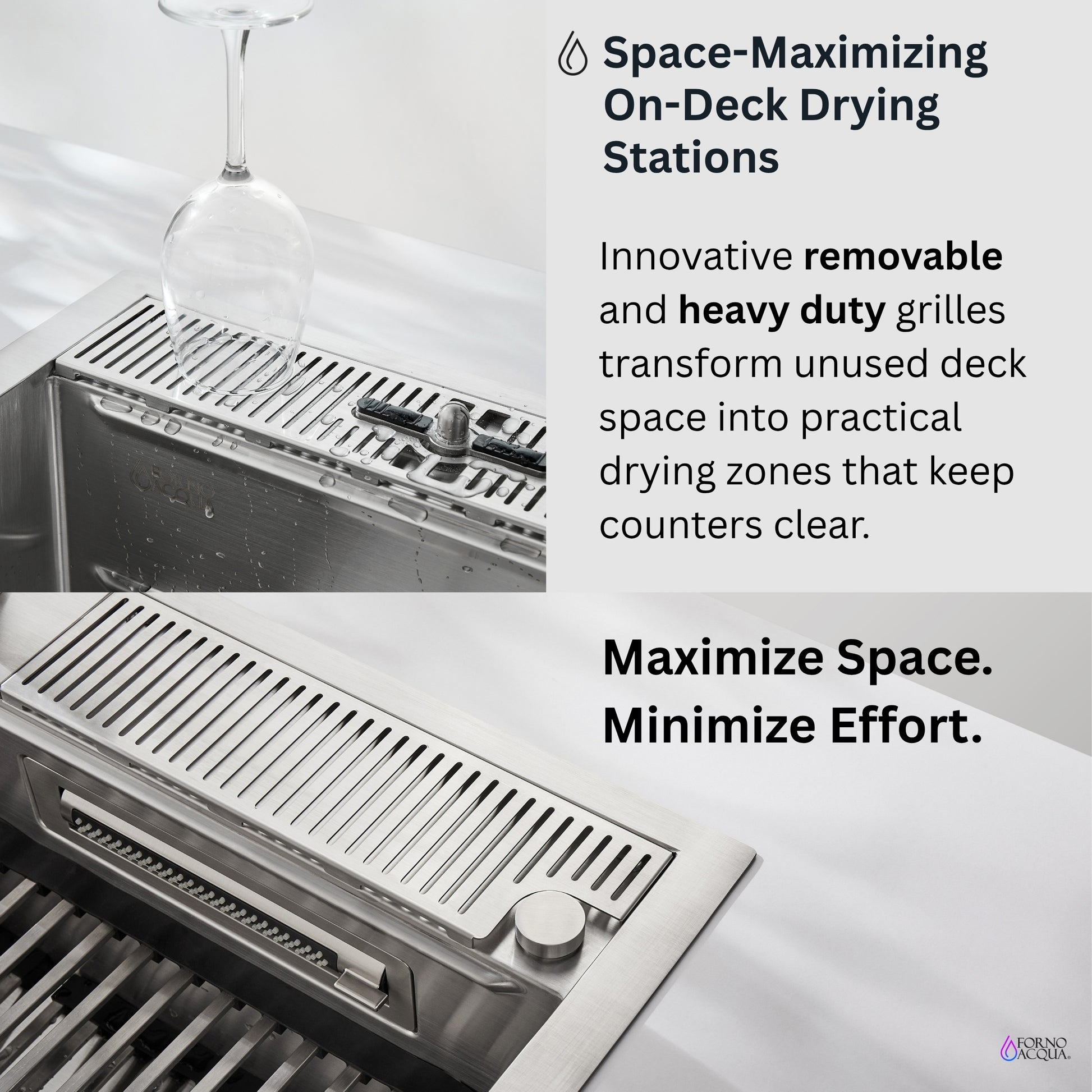 * Innovative On-Deck Drying Stations Turn Sink Deck into Space-Maximizing Dry Zones that Keep Counters Clear