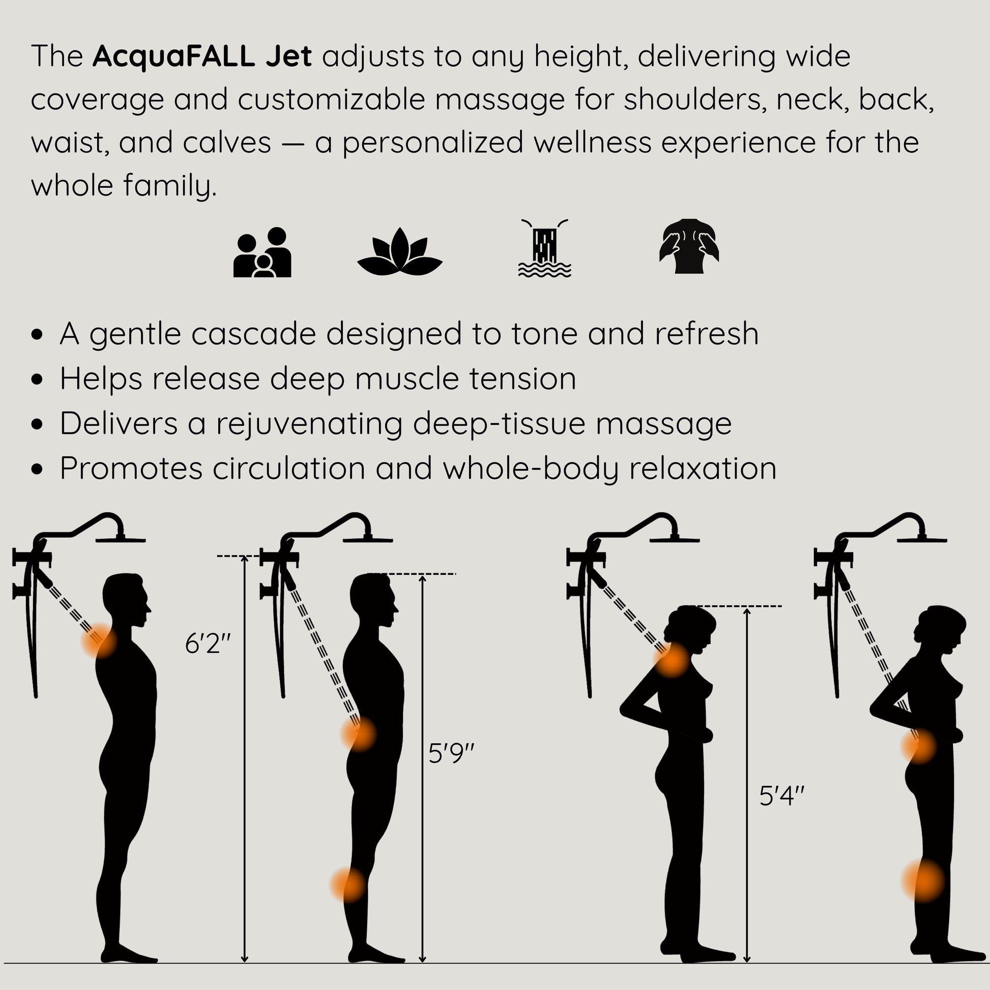 * Wide-Angle Directional Body Jet for All Heights and body parts: The AcquaFALL Body Jet pivots easily to accommodate users of different heights