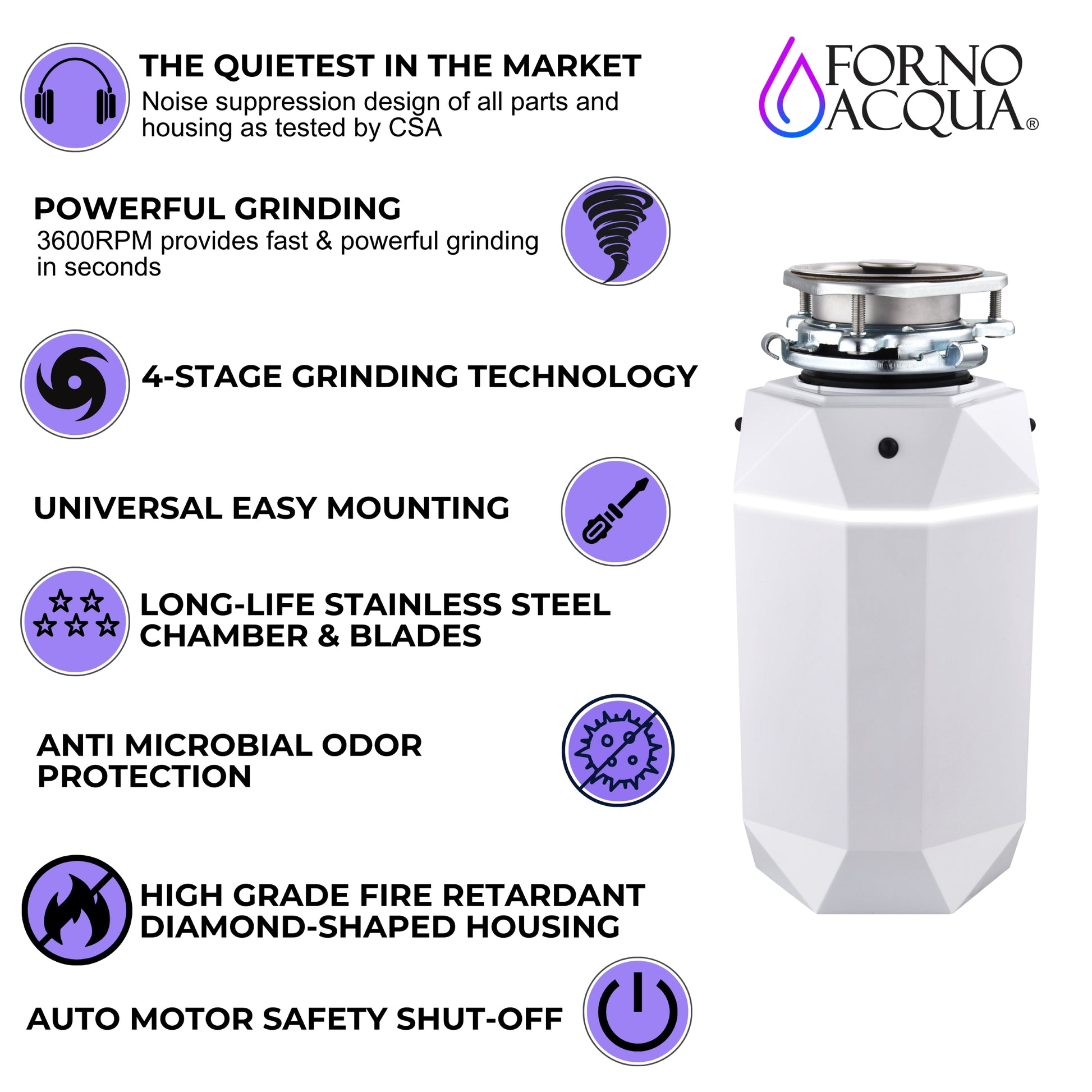 FORNO ACQUA BrightDIAMOND Moonstone 1HP Super Quiet Garbage Disposal Corded with Motion Sensor Cabinet Light & Pre-Wired Air Switch
