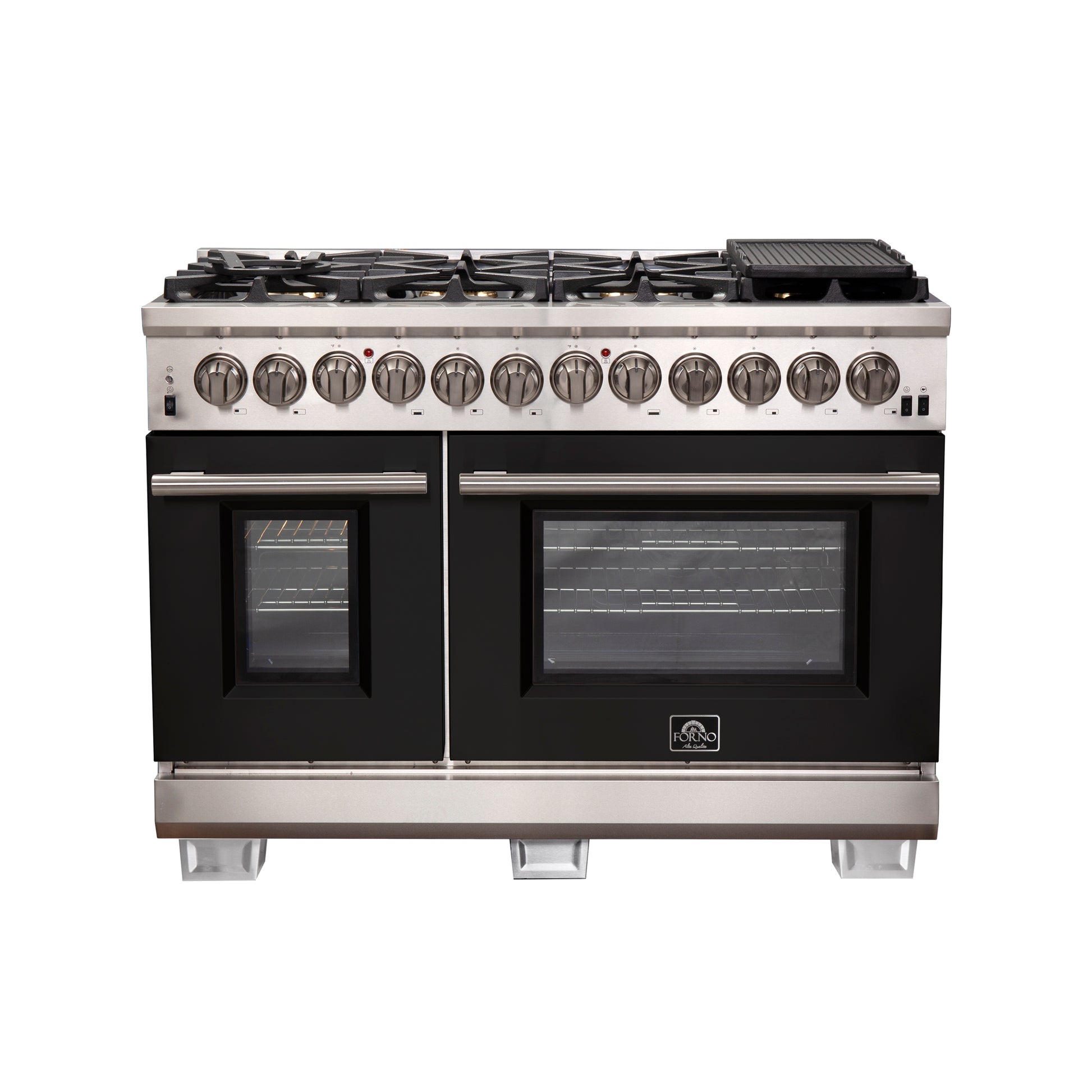 Forno Capriasca 48-Inch Freestanding Dual Fuel Range, 8 Burners, True Convection Oven, Black Doors